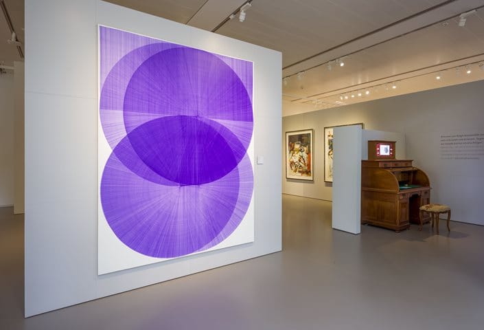 De strakke PU gietvloer die in een uni kleur gegoten is geeft een rustige uittaling waarde de witte wand elementen met de kunst goed in uiting komen.