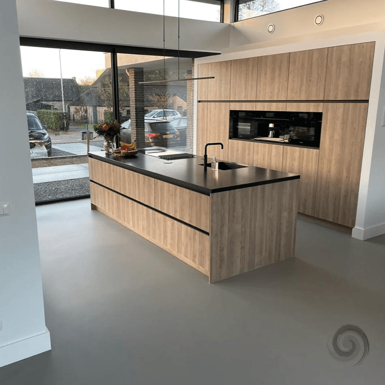 En het moet gezegd worden, de floorcolouringvloer met een potje zwart ligt er mooi strak bij dit nieuwbouwhuis in eersel. De kleur past prachtig bij de witte leefkeuken.